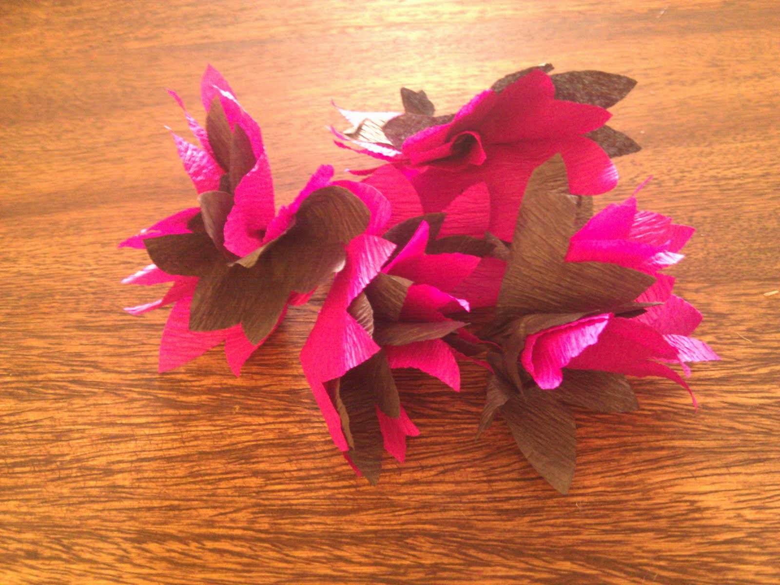 and finally fix your flower bouquets! add some crepe paper to represent the chains that they are hanging on and it will look like hanging pots on a brick wall... pretty i think!!!